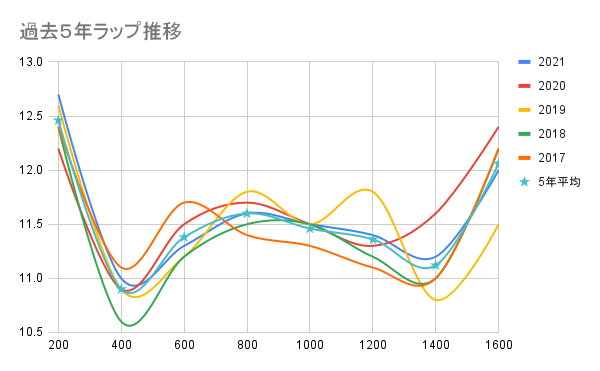 過去5年良馬場での施行ですので、ラップの推移が似たり寄ったりの波形を描いていますね。