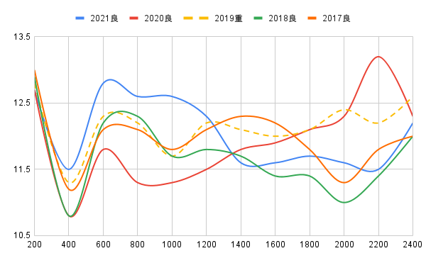 重馬場であればですが、よりペースが一定になるのですが、今回は前日に雨が少し降った程度で良馬場での施行が望めることもあって、19年以外のグラフに焦点を当てて、見ていきたいと思います。